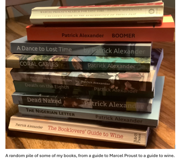 My name is Patrick Alexander. I was born in England and have lived in South Florida for the past forty years where, among other things, I write books and teach classes on wine appreciation.